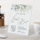 Cartel del Boda Pedestal del libro de la foto. Este diseño presenta un ilustracion acuático de vegetación y hojas de eucalipto con efecto verde y dorado en la parte superior.