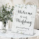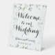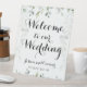 La vegetación eucaliptus acuarela en la parte superior e inferior, colgando viñas en el fondo con un guión de caligrafía de tipo batiente cursivo que da la bienvenida a los huéspedes a su boda con sus nombres y fecha boda.