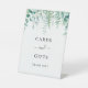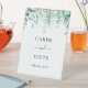 Un fondo blanco moda. Decorados con vegetación de eucaliptos de color verde acuático, helechos de bosque. Con el texto: Tarjetas y regalos, ¡gracias!