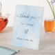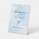 Un fondo azul claro/azul bebé decorado con destellos de plata falsos. Texto: gracias por venir. Por favor, tome uno.