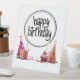 Este letrero peatonal muestra las palabras "Feliz cumpleaños" en una letra impresa única con letras negras dentro de un diseño circular con distinciones de fiesta de cumpleaños en este tema y estilo de cumpleaños. Impreso con impresión digital de alta calidad y a todo color disponible en 4 tamaños de pantalla de 1/16" de poliestireno de plástico blanco de 10" x 12" con base de 3".