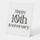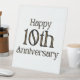 Este cartel peatonal muestra las palabras "Feliz décimo aniversario" en un tipo de letra original con letras doradas y contorno negro. Impreso con impresión digital de alta calidad y a todo color disponible en 4 tamaños de pantalla de 1/16" de poliestireno de plástico blanco de 10" x 12" con base de 3".