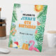 Un fondo azul acuático oscuro prepara el escenario para un fiesta de playa de color acuático en esta zona peatonal. Las palmeras decoran los lados del pegatina con objetos de playa como una pelota de playa, un castillo de arena y un flotador flamingo repartidos entre las hojas. Ofrece una excelente bienvenida o un cartel de instrucción para una fiesta de cumpleaños temática de playa para niños o adultos, una fiesta de cumpleaños, una soltera o una soltera, una barbacoa o cualquier reunión informal de temática playera. Disponible con productos a juego.