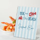 ¡Hervir en la playa! Fin de semana de despedida de soltera de mariscos con cangrejo y langosta contra un fondo a rayas azules costero