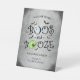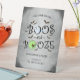 El cartel de peatón para adultos fiesta Boos & Booze de Halloween presenta un fondo de niebla gris ahumado, murciélagos volando, un fantasma azul irrisorio volando a través de "boos", una taza de alcohol verde zumbante con un globo ocular rojo y paja.