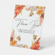 Elegante señal de ducha de novia con floral de caída rojiza, hojas de arce, bellotas y elegante caligrafía.