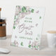 Este hermoso cartel peatonal invitará a los huéspedes de su boda a firmar su libro de visitas. Tiene flores moradas claras y hojas verdes con algunas mariposas románticas