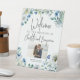 Flores alegres de peonía blanca y hojas de acuarela verde forman un hermoso borde en este bonito azul floral símbolo de velador de boda. Una moda, un moderno garabato manuscrito de los nombres de la pareja para dar la bienvenida a la gente a su boda por encima de su foto de compromiso.