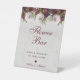 Un letrero de Flor Bar para una ducha de novia/una ducha de matrimonio. En la frontera superior, hay peonías rojas y blancas borgoñas. El título "Flor Bar" y los nombres de la novia y el novio están escritos en un elegante guión caligráfico de color burdeos, el resto en gorras negras. encima de los nombres hay un pequeño corazón borgoñoso. El fondo es de mármol blanco. Las peonías de borgoña y blanca son de un ramo pintado por el pintor y botánico Pierre-Joseph Redouté(1759-1840), ahora de dominio público.