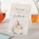 Un fondo de degradado de oro rosa y subió, una calabaza de color crema y flores. Texto: Por favor, firma nuestro libro de invitados
