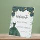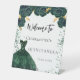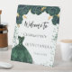 Un cartel de bienvenida para una fiesta de cumpleaños de Quinceañera. Un fondo blanco decorado con un vestido verde, flores, rosas y confeti. Personalice y agregue un nombre y una fecha.