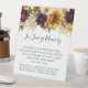 Una señal de memorial de boda que se puede colocar en una exhibición de mesa. Plantilla de señal rústica y elegante. Cuenta con un girasol amarillo, una flor roja borgoña y un borde de hortensias blancas en la parte superior. Esto lo hace perfecto para una boda de otoño. En memoria de está escrito en una fuente moderna y elegante que es muy popular. Hay una declaración conmemorativa reflexiva y luego se puede enumerar al difunto. Esto es parte de la colección de boda de girasoles y borgoña que tiene muchos componentes.