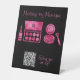 Estos carteles peatonales de vidrio presentan siluetas cosméticas metálicas rosadas calientes, texto rosa y un código QR de personalizable en la parte posterior. Son la forma perfecta de promocionar su negocio y conectarse con clientes potenciales en su salón o en bodas y otros eventos en el sitio.