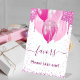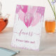 Un signo de la mesa favorita de un partido. Un fondo blanco con elegantes chispas falsas y globos rosa pastel y rosa caliente. Letras rosas.