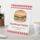 Diseñado para fiestas que tienen una barra / estación de hamburguesas DIY que permite a los invitados construir su propia hamburguesa con los rellenos y coberturas que disfrutan. El diseño presenta la ilustración de Destei de una hamburguesa que tiene un pan con semillas de sésamo que está relleno de queso, lechuga, carne de ternera, tomate, kétchup y pepinillos. El color de fondo principal es blanco, mientras que la parte superior e inferior tienen un patrón de gingham rojo. También hay dos áreas de texto personalizables en fuente de color rojo.
