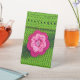 La imagen floral verde y rosa impresa en un pedestal es de una foto de una creación crocheted original diseñada a mano y derechos reservados © por el diseñador publicado Delores Chamblin. En el soporte de plástico se reproduce la imagen de la única bolsa artesanal con puntas elegantes, flores, hojas y botón perlino.