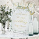 Un cartel de bienvenida a nuestro Boda con una jarra de vidrio verde del mar con un ramo de torrenciales peonías blancas y verde eucalipto de plata con las palabras "Bienvenidos a nuestro Boda" dentro del frasco junto con sus nombres y fecha numérica de boda a lo largo del fondo.