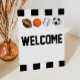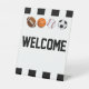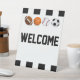Este es un letrero de bienvenida mini para baby shower. Tiene un tema de deportes con rayas de árbitro.
