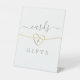 Elegante y simple letrero de mesa de boda blanco con corazón de cuerda dorada falsa y escritura de caligrafía moderna.