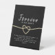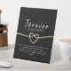 Elegante y sencillo letrero de pedestal para mesa conmemorativa de boda en pizarra negra y blanca con corazón de cuerda dorada falsa y letra de caligrafía moderna.