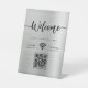 Cree una impresión memorable con nuestro letrero de pedestal de código QR WIFI de escritura de bienvenida moderna en metal plateado. Este diseño simple pero elegante presenta una elegante escritura de bienvenida con un logotipo de wifi simple debajo en un estilo moderno contra un fondo de metal plateado falso cepillado. La información de la red, incluida la contraseña, se presenta de manera clara y espaciosa.