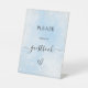 Un fondo azul claro/azul cielo decorado con finos destellos de plata. Texto: Por favor, firma nuestro libro de visitas.