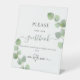 Fondo blanco. Decorado con verde de eucalipto pintado con acuarela. Con el texto: Por favor firme nuestro libro de invitados. Letras negras y verdes. Sr y Sra con un corazón.