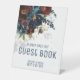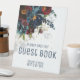 Un moderno y elegante ramo floral color de agua de la marina burdeos con su sombra se derrama suavemente en este cartel de la mesa del Please Rótulo Our Guest Book (Por favor, nuestro libro de invitados) con salpicaduras y elementos dorados brillantes, con tus nombres y citas debajo de un estilo moderno.