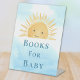 El Rótulo Pedestal Books for Baby Baby Shower cuenta con un sol sonriente de color amarillo, una tipografía elegante y un fondo azul del cielo. Acuarela original © Michele Davies.