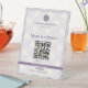 This light purple bakery QR code table sign is perfect for cafes, bakeries. patisseries. This 'scan to order' scannable bakery sign features a pastel purple and cream lattice print with deep purple text featuring your company social media and website details. Add your own logo in seconds and update all text before placing your order.