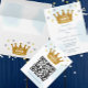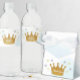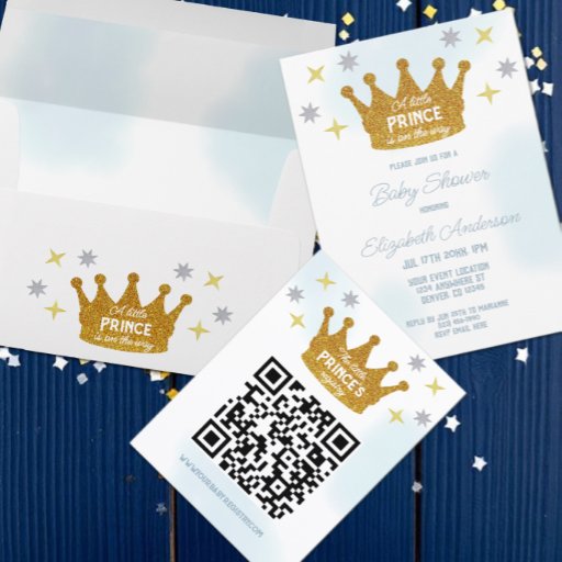 A little prince is on the way! Boy baby shower with gold crown and silver and gold stars with dreamy blue watercolor background
