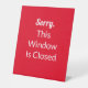 Puede editar el texto en blanco para crear un mensaje personalizado para su empresa. El cartel rojo dice: Lo siento, esta ventana está cerrada. La línea superior del texto mostrado es un guión.
