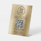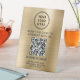 Pancarta de mesa promocional moderna y sencilla para su negocio u organización con un fondo metálico de imitación de oro cepillado. Agregue el logotipo de su empresa, el código QR y dos líneas de texto personalizado, como "escanear para conectarse con nosotros" y el nombre, dirección y número de teléfono de su empresa.