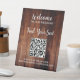 Madera de grano rústica Código QR boda sentado en un pedestal. Agregue la dirección URL del código QR y el texto que desee personalizar.