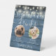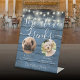 Con luces de cuerdas de bonito sobre un fondo azul rústico de madera, este elegante cartel de mascota de bebidas es perfecto para su celebración boda. Diseñado por Thisisnotme©