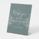 Elegante señal de mesa conmemorativa de boda en verde salvia con letra de caligrafía manuscrita moderna, corazón de cuerda plateada y encaje floral dorado vintage. Desearía que estuvieras aquí.