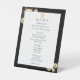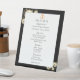 ¡Los menús de mesa son una gran idea! El diseño presenta un elegante fondo negro con rosas sepia rodeando un rectángulo blanco que muestra el texto del menú del personalizable, que se muestra en el formato tradicional. En la parte superior se muestra una cruz de oro con anillos unidos. Diseñado para coordinar con la suite boda Elegant Rosas.