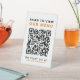 Un moderno cartel de personalizable para su restaurante o cafetería con un código QR para que los clientes puedan escanear su menú sin contacto. "Escanear para ver nuestro menú" está en negrita en tipografía negra y naranja (contáctenos si desea cambiar los colores). Agregue líneas de texto adicionales como su sitio web.