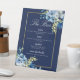 Elegantes rosas azules y blancas decoran este hermoso pedestal de menú de bar para una boda de invierno. El marco de falso pan de oro chic está acentuado con hermosas flores de acuarela índigo y un hermoso brote botánico de color amarillo claro