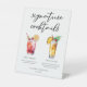 Este rótulo de velador del menú de cócteles de moda destaca por su tipografía negra personalizado sobre 2 bebidas y sus ingredientes para el bar boda. Un bonito templo sucio de Shirley y un dibujo de Piña Colada le dan un toque fresco a su menú del bar. Con los nombres de la pareja y la fecha de recepción.