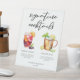 Este rótulo peatonal de cócteles de moda presenta una tipografía negra simple sobre 2 bebidas y sus ingredientes para su bar boda. Un bonito verano, Sangria y el dibujo de una mula moscovita le dan un toque fresco a su menú del bar. Con los nombres de la pareja y la fecha de recepción.