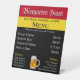 Cartel del menú de la pequeña empresa con temática alemana Biergarten o Oktoberfest hecho con los colores de la bandera alemana de negro, rojo y amarillo. Gráficos de un stein de cerveza de vidrio decora la parte inferior izquierda del cartel. El texto en personalizado negro, blanco y amarillo está listo para personalizar su negocio.