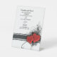Un romántico menú temático boda. Dos corazones con la inicial de la novia y el novio. Los elegantes rollos y las flores dan un respaldo a los corazones. Este aspecto irá bien en cualquier estación boda, primavera, verano, otoño o invierno. Ideal para un boda moderno y perfecto para un boda clásico.