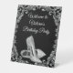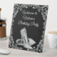 Cartel de bienvenida de la fiesta de cumpleaños en negro y plata para mujeres con hermosos zapatos altos de tacón plateado en una elección de tu propio fondo de color. Este hermoso signo de bienvenida de zapatos altos en tacón negro y plateado se personaliza fácilmente con el texto de su elección. Puede cambiar el color de fondo y mover y redimensionar los zapatos y el marco según sea necesario.