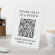 Add your custom text to this black and white acrylic table top sign. All the modern clear text is editable. Add a QR code to create the perfect sign for your needs. "PLEASE LEAVE US A REVIEW" sign would suit well to any small business. See my modern minimalist black and white business suite for matching promotional and office display items.
