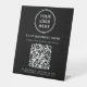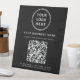 Señal de pedestal de la mesa negra moderna para su empresa con su código QR para que los clientes puedan buscar una lista de sus productos, servicios, precios, otra información o pagos móviles. Sube tu logotipo y el código QR del sitio web y agrega tu texto personalizado, como el nombre de la empresa, el número de teléfono, la dirección de la calle u otra información en una tipografía blanca simple.