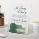 Este hermoso cartel de mesa está diseñado como una manera de recordar a los que han fallecido y que no pueden estar contigo en tu día especial. El diseño se compone de un único rosa de color verde esmeralda de tallo largo que se encuentra en su lado reflejado o reflejado en una piscina de agua. El mensaje es totalmente personalizable y dice: En la memoria amorosa. Esta vela quema para aquellos que no pueden estar aquí hoy pero cuya luz brilla para siempre en nuestros corazones. Hay espacio para los nombres de la pareja y la fecha de boda. Hermoso tributo en su celebración boda.