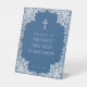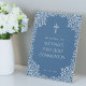 Un clásico cartel de bienvenida de niño azul en primera comunión. Tiene un marco vintage, ornamentado de Relieve metalizado falso plateado de ramas intrincadas con hojas. Encima del texto hay una cruz, también de un falso Relieve metalizado de plata. El fondo es azul clásico, todo el texto es gris claro y se puede cambiar.