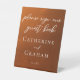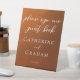 Siga la tendencia otoñal de tonos tierra con nuestro naranja quemado al degradado marrón caída símbolo de peatón de boda. Tipografía blanca simple sobre un fondo rústico para un aspecto minimalista. Por favor, firma nuestro libro de invitados. Los tonos bohemios que recuerdan a la arcilla de terracota resaltan su elegante caligrafía en esta moderna señalización de bienvenida de color de textura desvanecida.