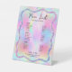 Diseño de señas peatonales con fondo holográfico, chispas iridiscentes y una disposición moderna con efecto neón moderno. Con espacio para sus servicios y precios, puede utilizar este menú de servicios para su salón de belleza, spa, estudio de uñas, maquillaje y peluquería o cualquier otro negocio. Cree una tabla de lista de precios de glam con los signos más importantes de su marca utilizando este diseño de efecto opal holograma.